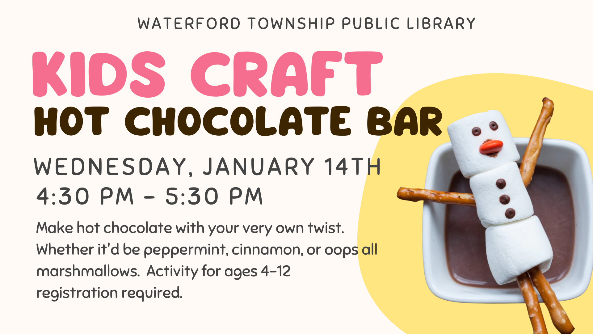 Waterford Township Public Library 386 White Horse Pike, Atco, NJ, United StatesMake hot chocolate with your very own twist. Whether it'd be peppermint, cinnamon, or oops all marshmallows. Activity for ages 4-12 registration required. Led by…