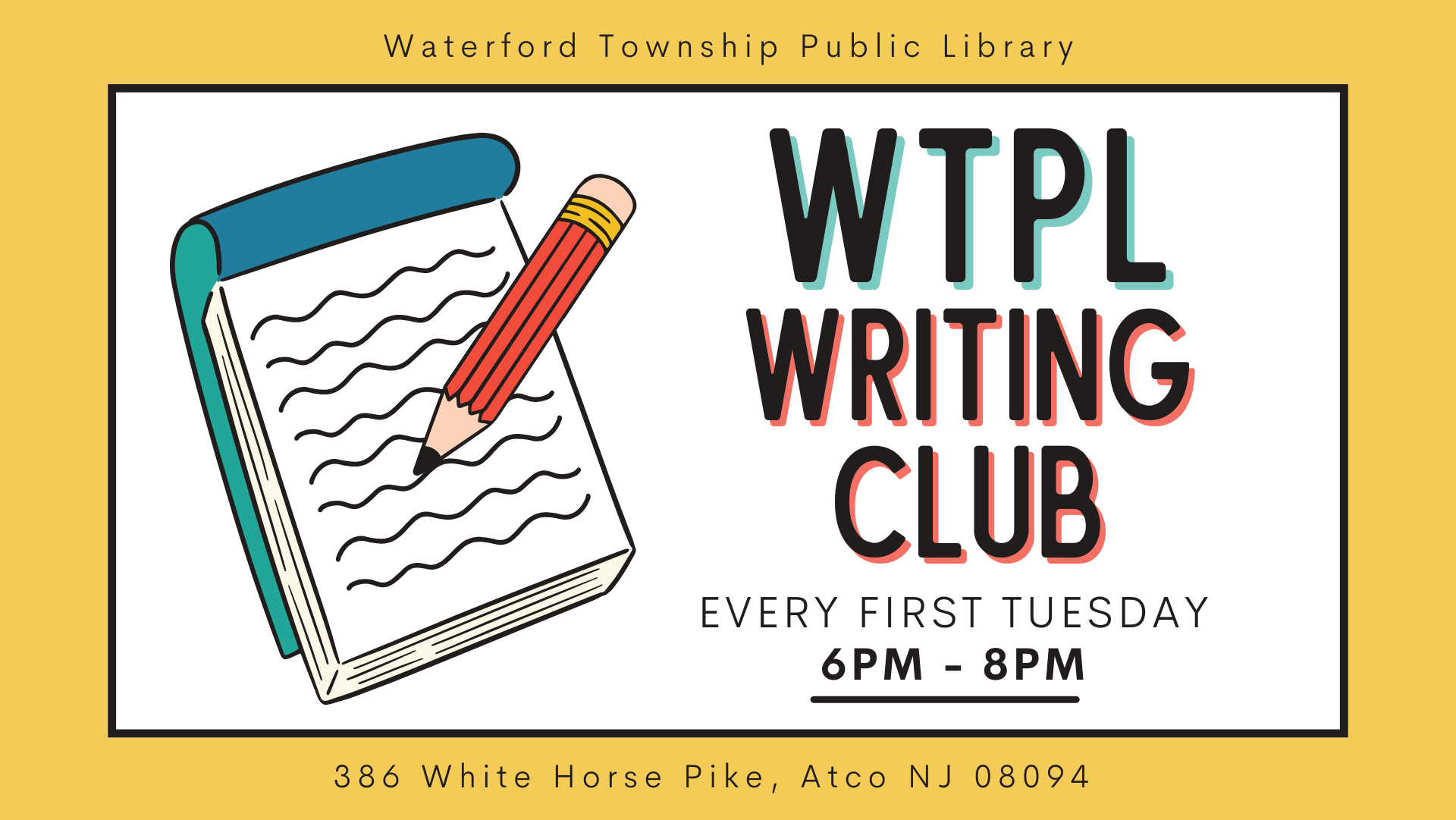 Waterford Township Public Library 386 White Horse Pike, Atco, NJ, United StatesCalling All Writers! Join Our Monthly Writing Group at Waterford Township Public Library! Are you an aspiring writer seeking inspiration, feedback, or a supportive community…