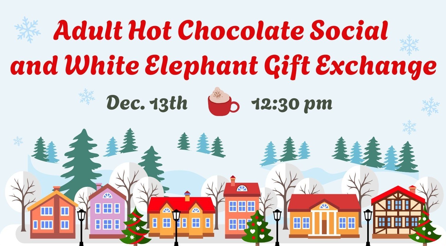 Come socialize and enjoy some hot chocolate and participate in a white elephant gift exchange. Bring a gift under $10. (Gifts may be humorous but…
